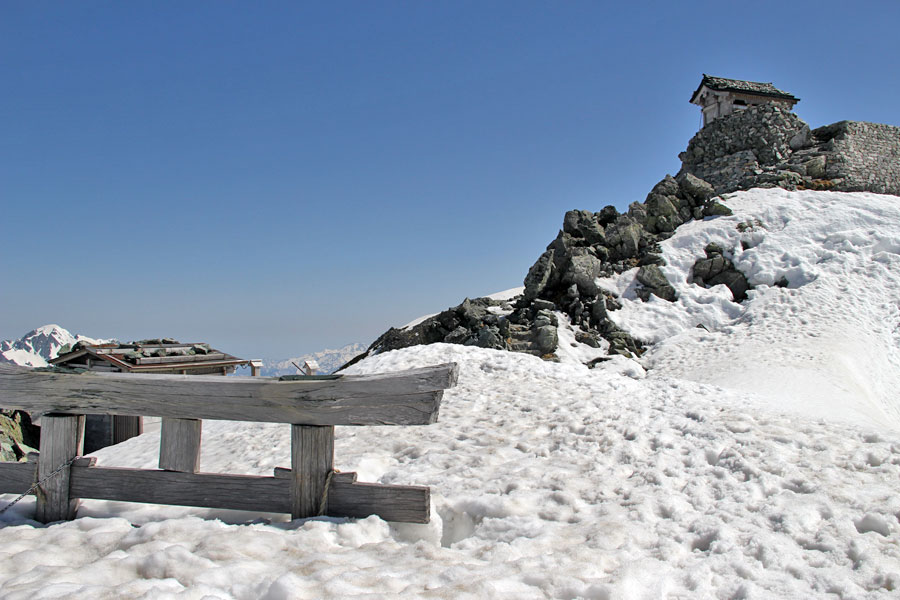 山頂の鳥居周辺は残雪たっぷりで、鳥居は深く埋もれていました。