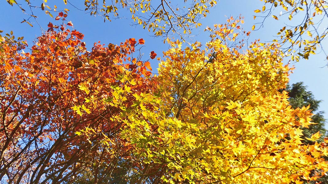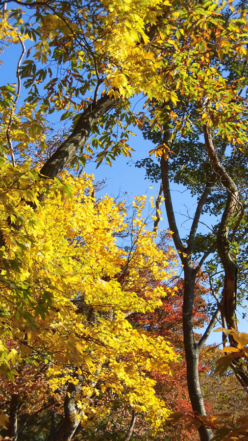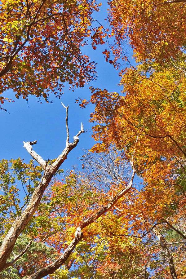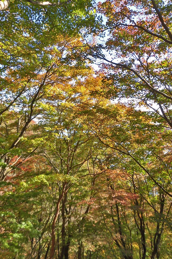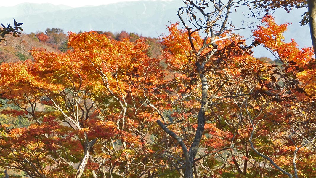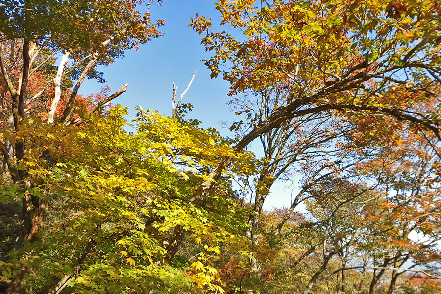杉林を抜け、広葉樹林帯となり、登りが緩やかになると、紅葉を眺めながらの登山となる。