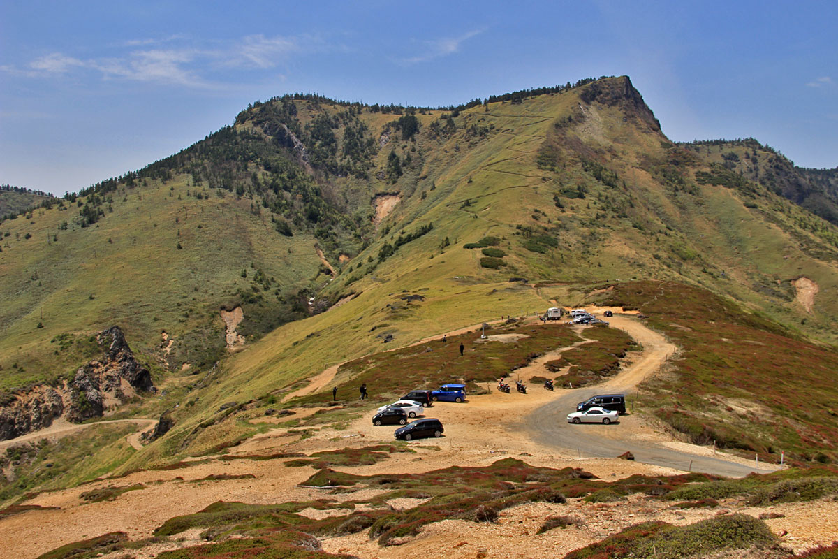 車を置いて、また歩いて丘を登り、志賀草津道路を見下ろす